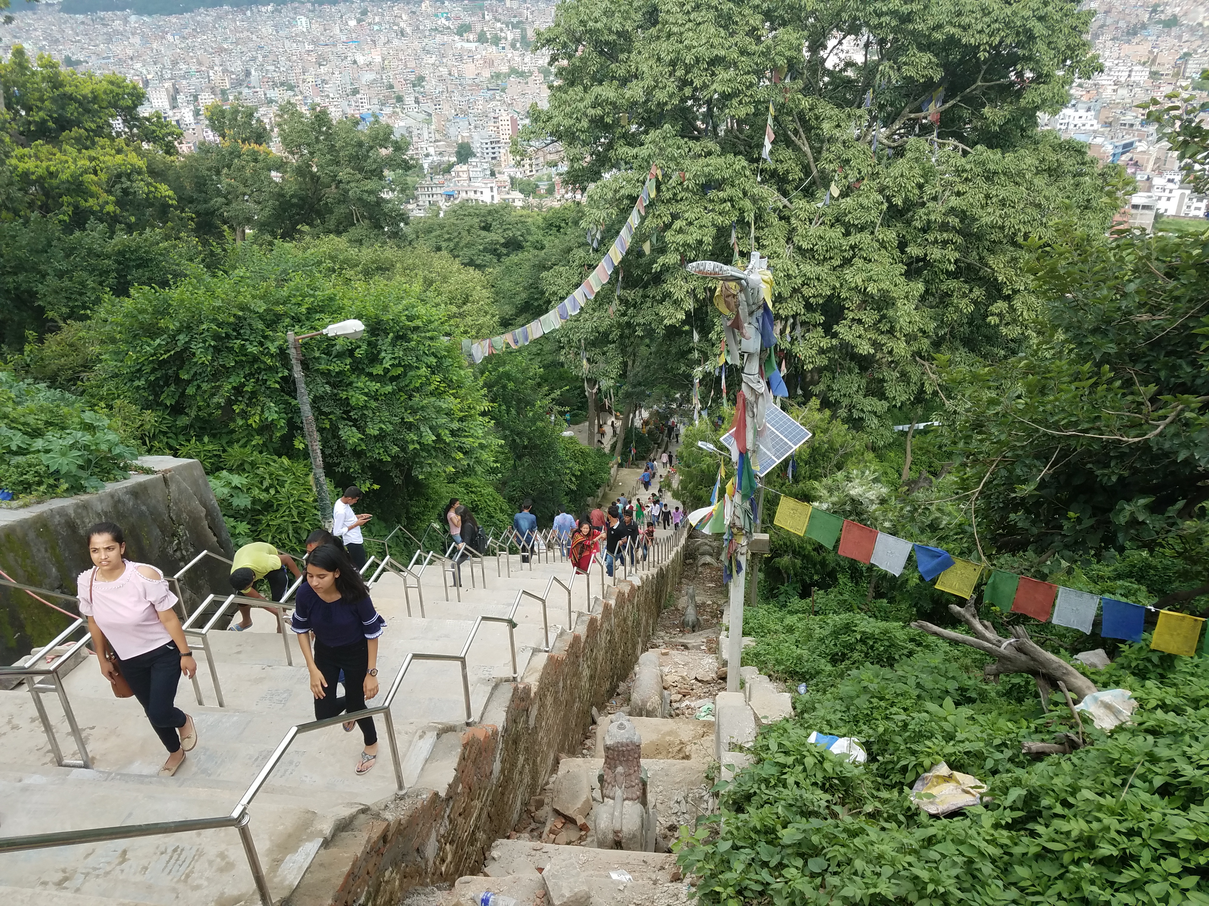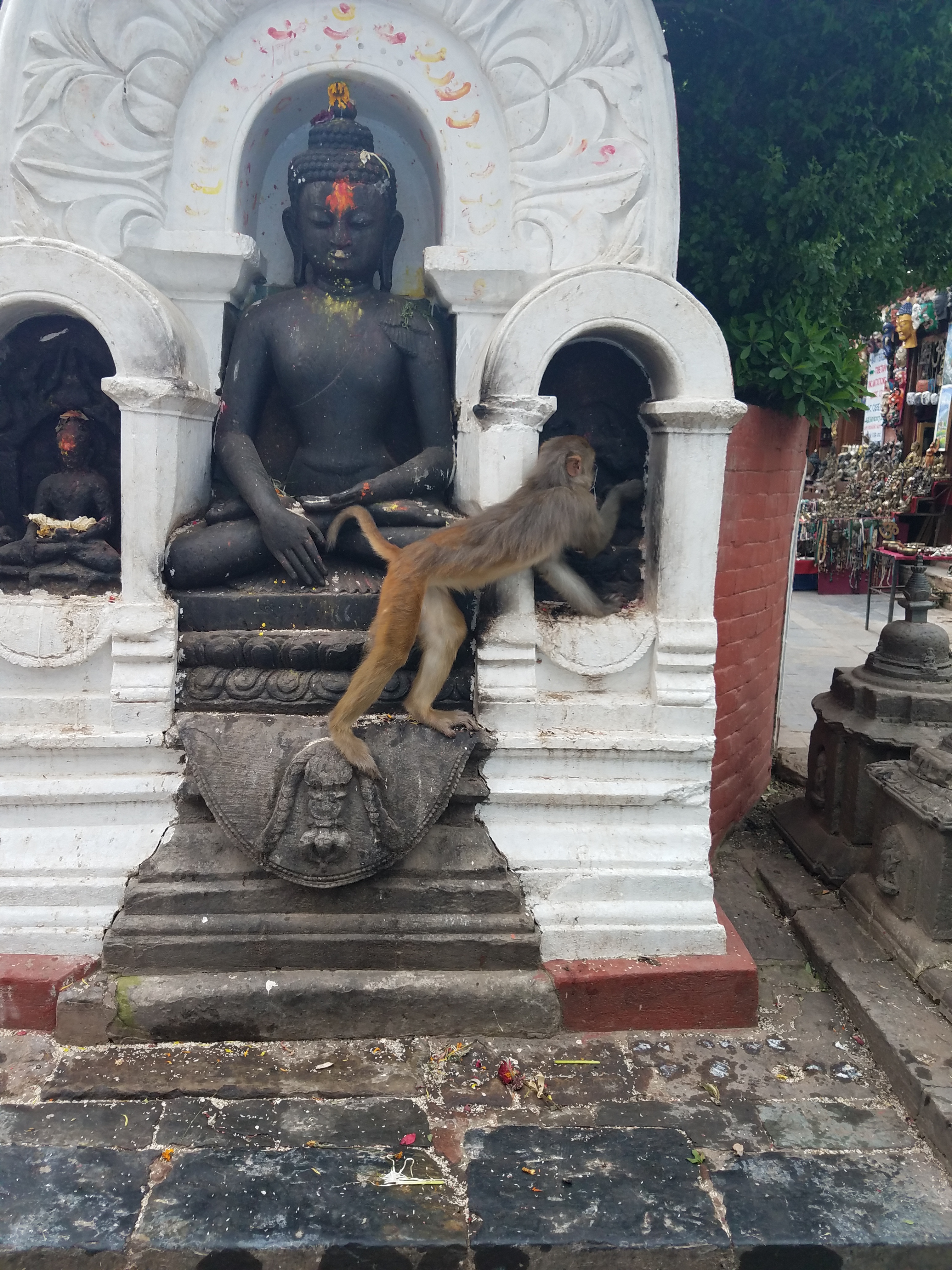 After climbing up many, many steps to the top of Monkey Temple, right at the very top when you can see the end, there is a small ticket window where visitors pay a small fee. ($2-3 USD) I knew there was a fee, but on a hot sunny day and seeing the end so close I didn’t notice the office window off to the left and an officer flagged me down to directed me over to pay the fee.