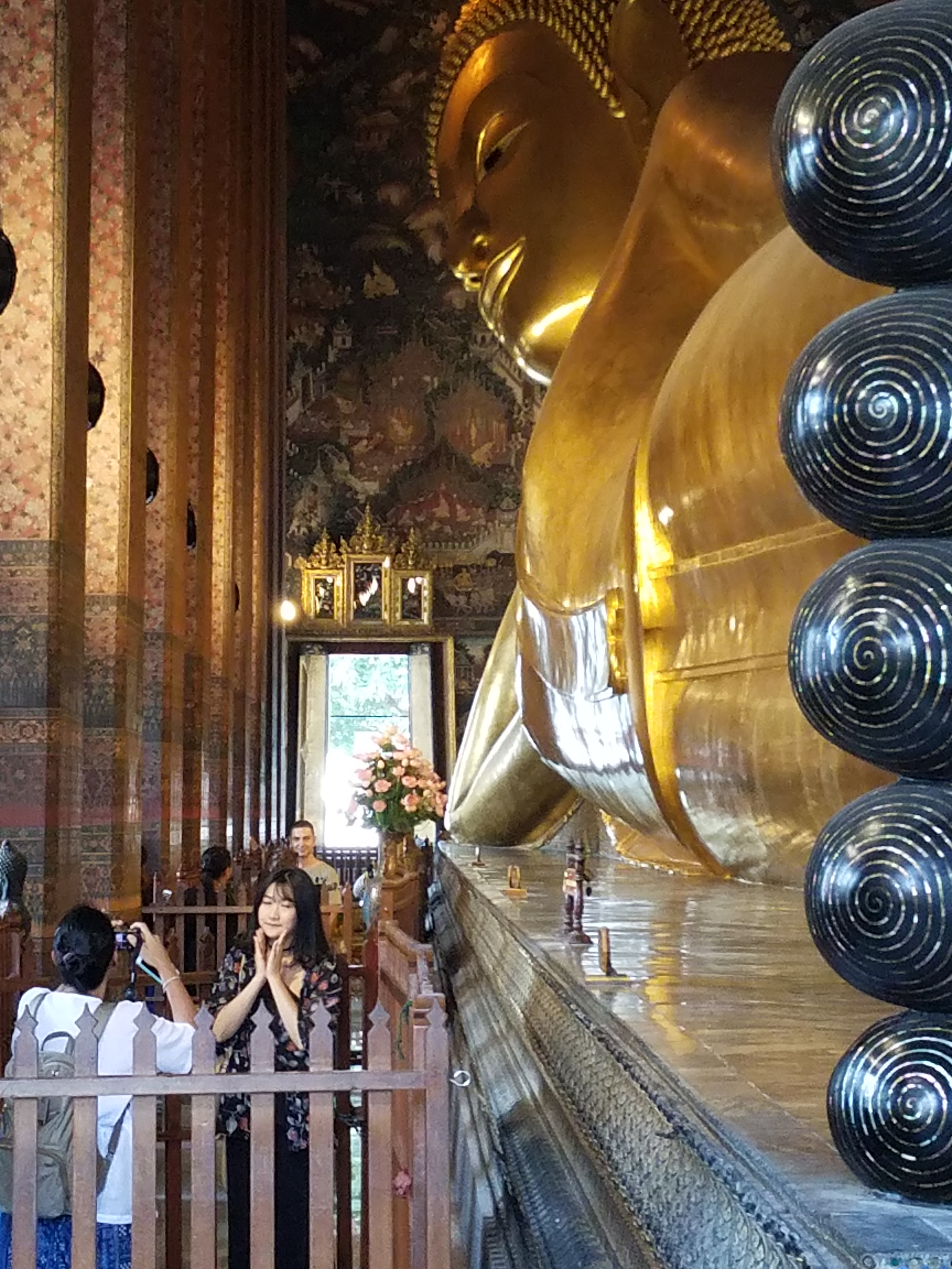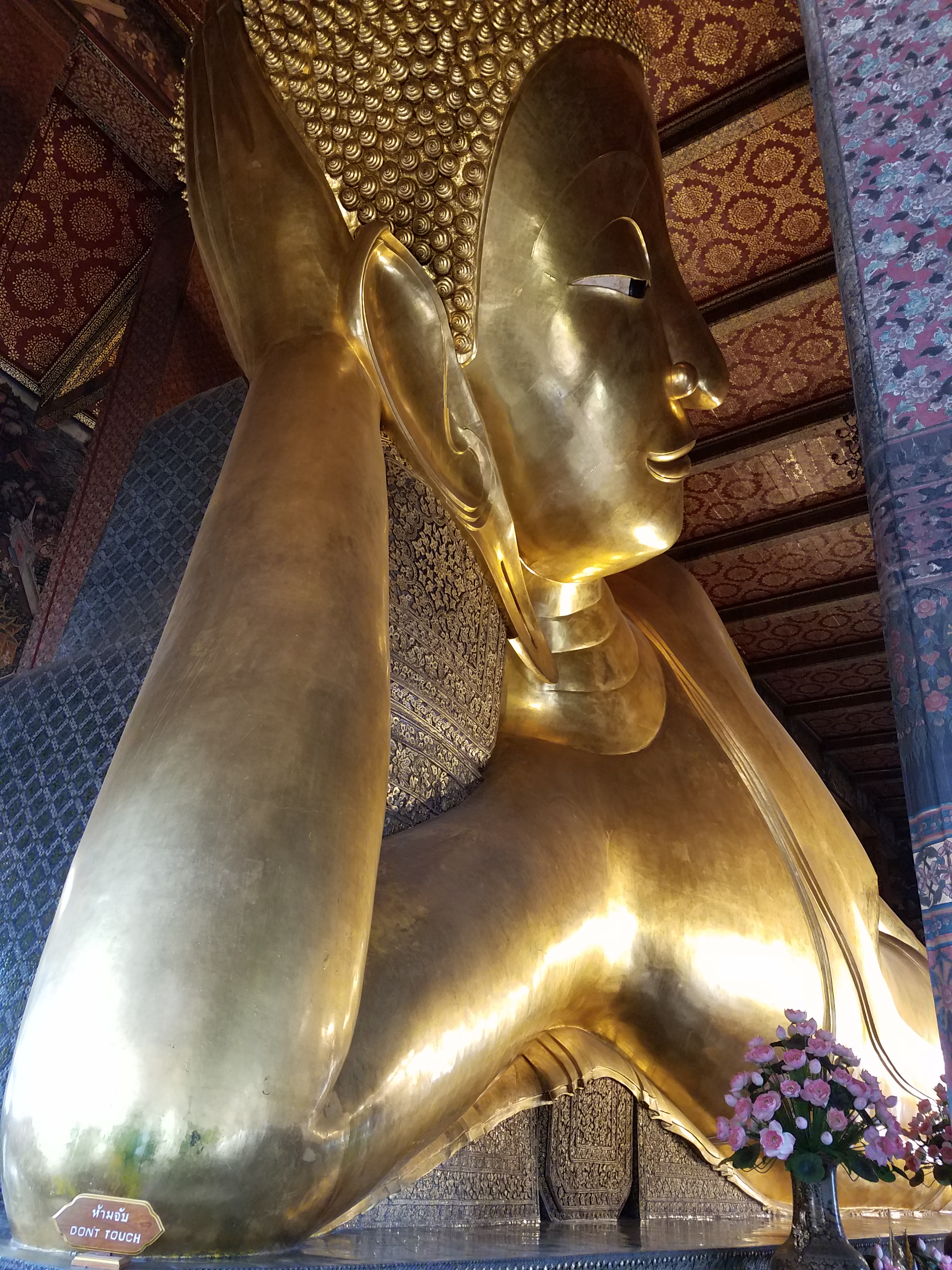 This is the huge reclining Buddha with its pearl feet together at the far end. When you enter this temple, after you take your shoes off and place then in a mesh bag to carry with you, you are able to walk almost all the way around the grand Buddha. Walking in you start at the head facing front and walk down to the feet. There are displays along the walls with the history and places to pray. When you finally wrap around the feet and start walking towards the head you will hear the tink tink tink of coins going into medel pots all down the wall makes a wonderful and unexpected background when seeing this giant golden reclining Buddha.