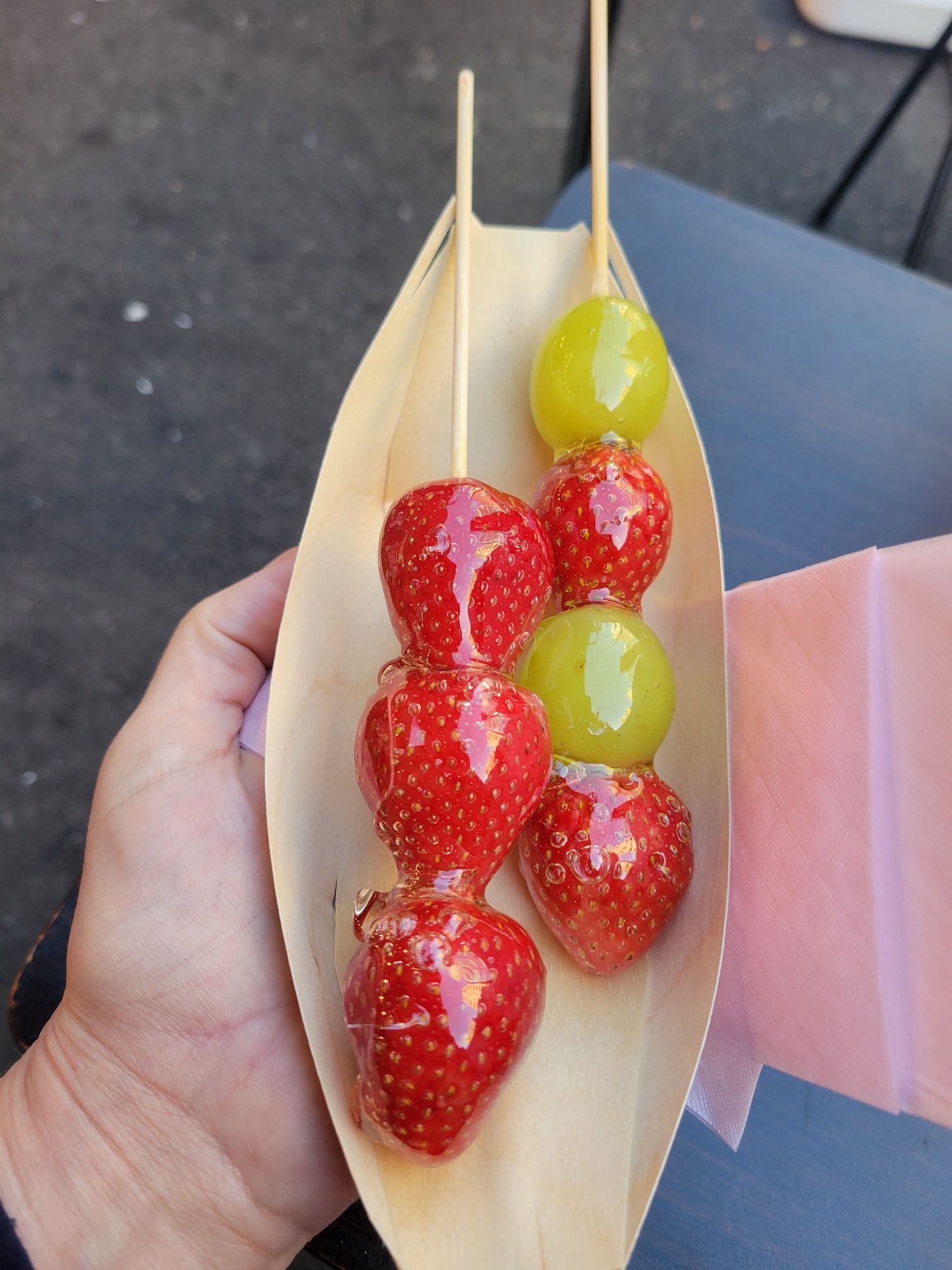 Any type of kitchen supply you need or didn’t know you need you can find at multiple shops throughout the market. The shops hours very from one stall to the next, some are labeled and some are not and it ends up being luck of the draw. My favorite foods was the different type of sushi and the hard shell candy fruit called tanghulu. The sushi melts in your mouth and comes with a cup of tea and soup, with four types of tuna; lean tuna , medium fatty tuna, fatty tuna , and minced tuna , and a Japanese omelette. The tanghulu is hot sugar they dip fresh fruit of skewers and let then harden. Biting into the fruit is a crunchy hard outer shell and warm sweet fruit inside and is amazing.